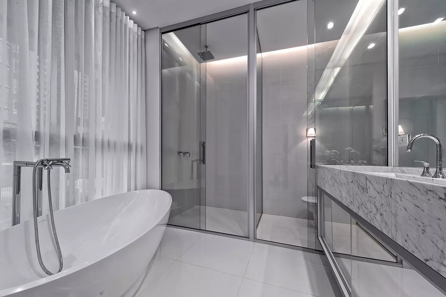 - Banheira de sobrepor com design especial na suíte master e tampos e cubas em mármore importado nos banheiros das suítes