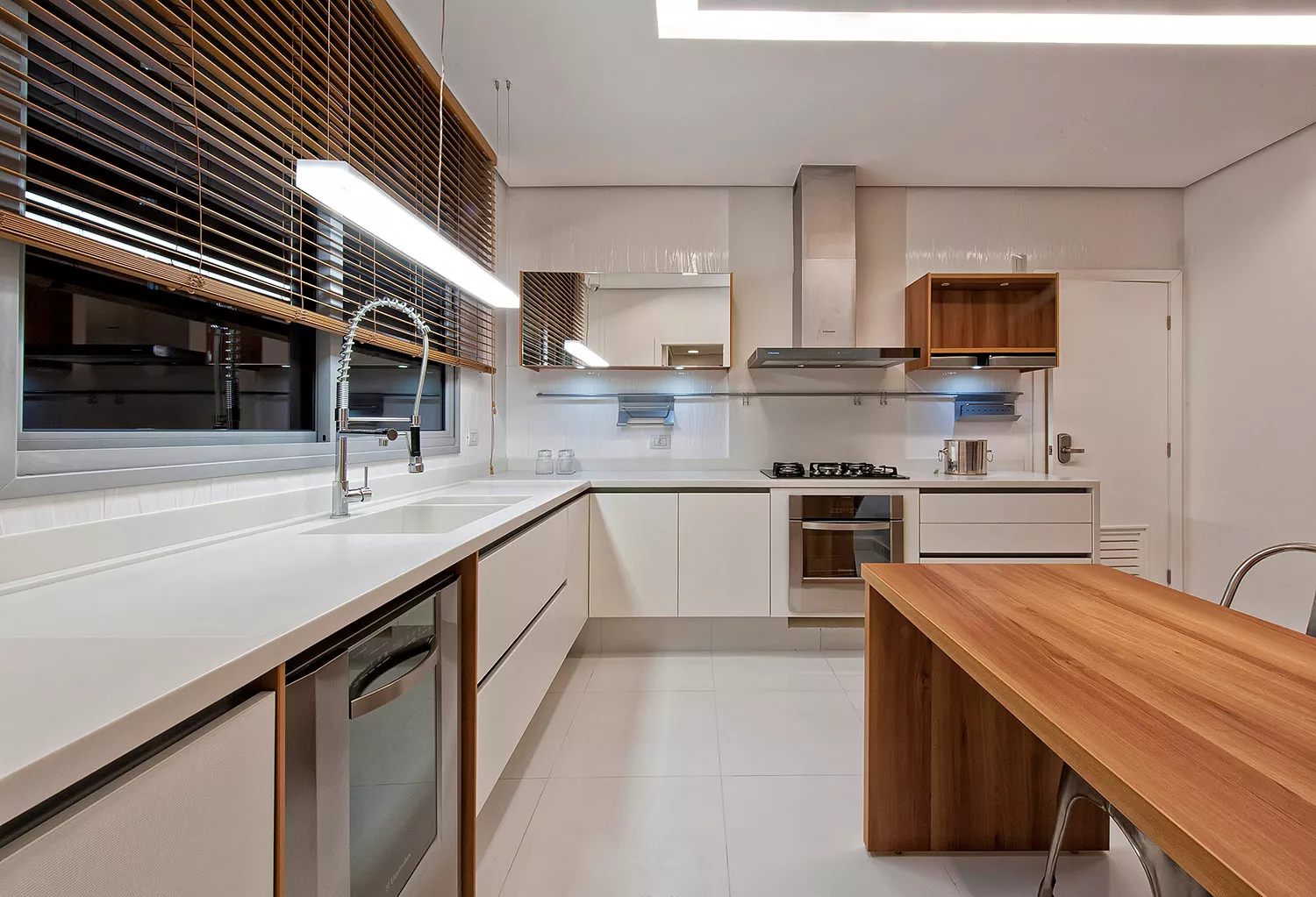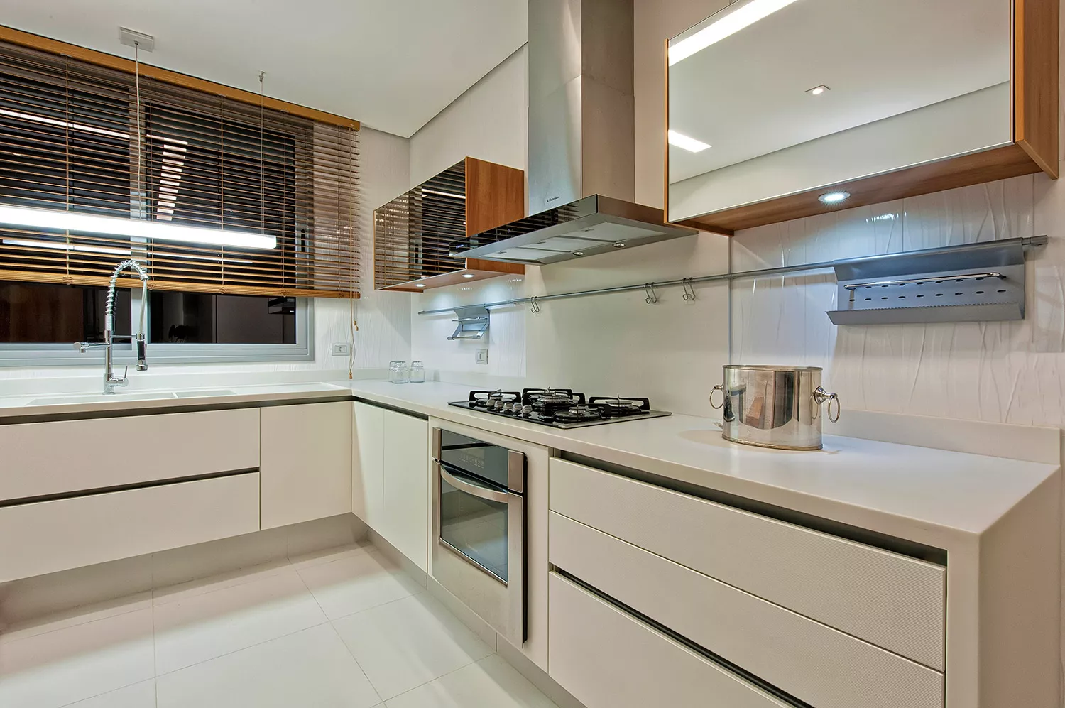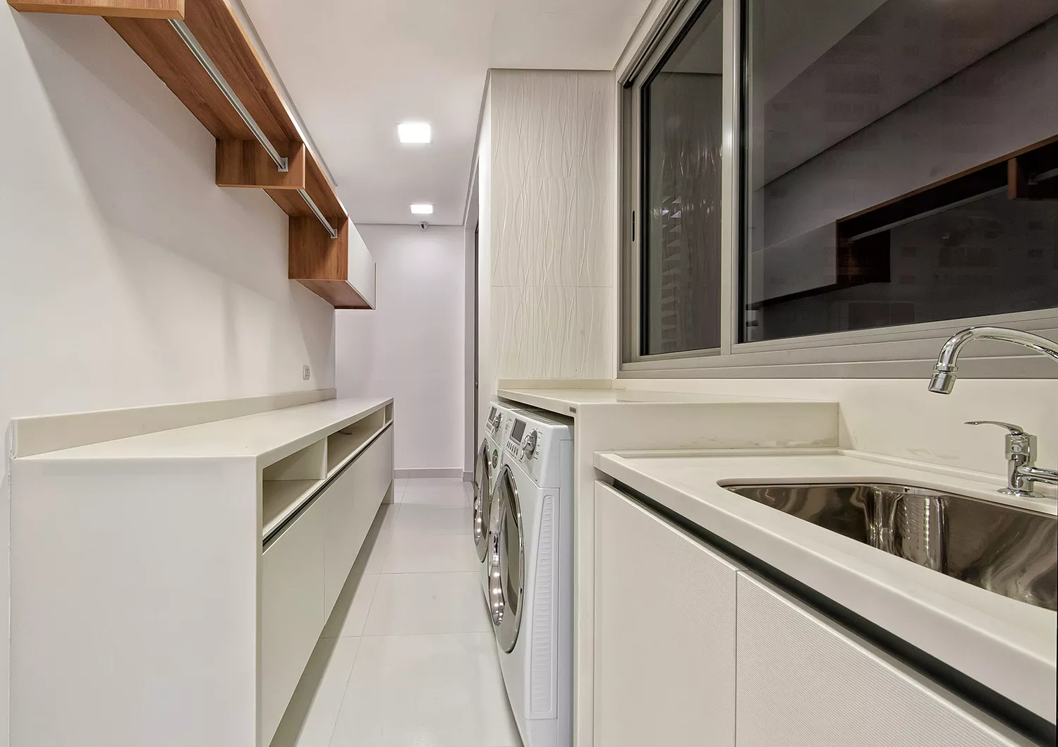 - Porcelanato branco retificado (80 cm x 80 cm) na cozinha, nos banheiros, nas salas, nas sacadas e na área de serviço