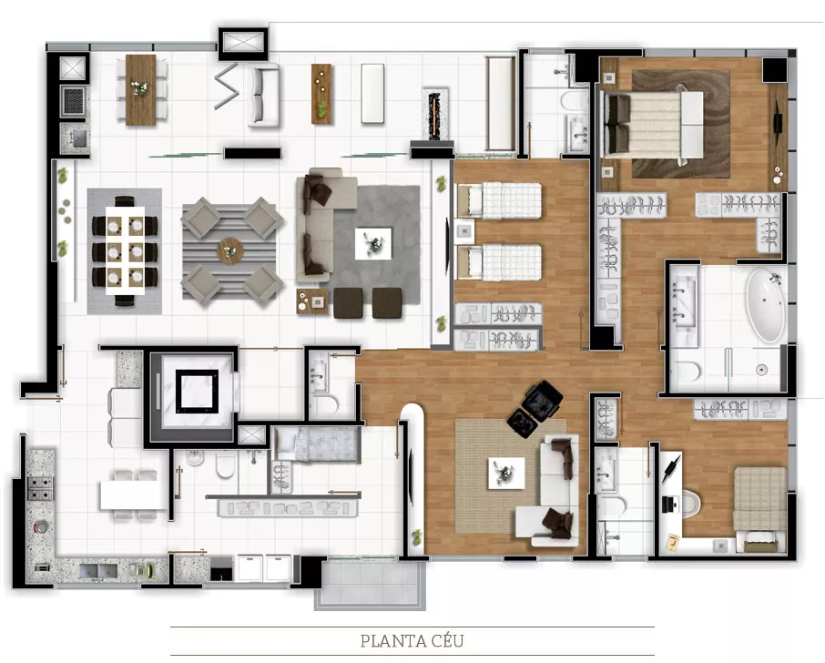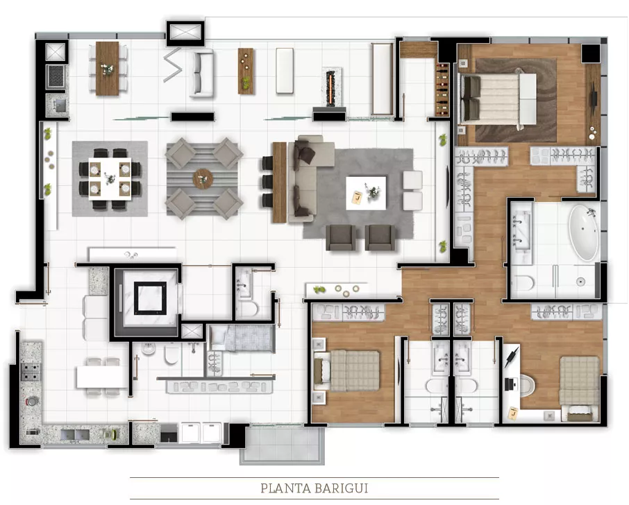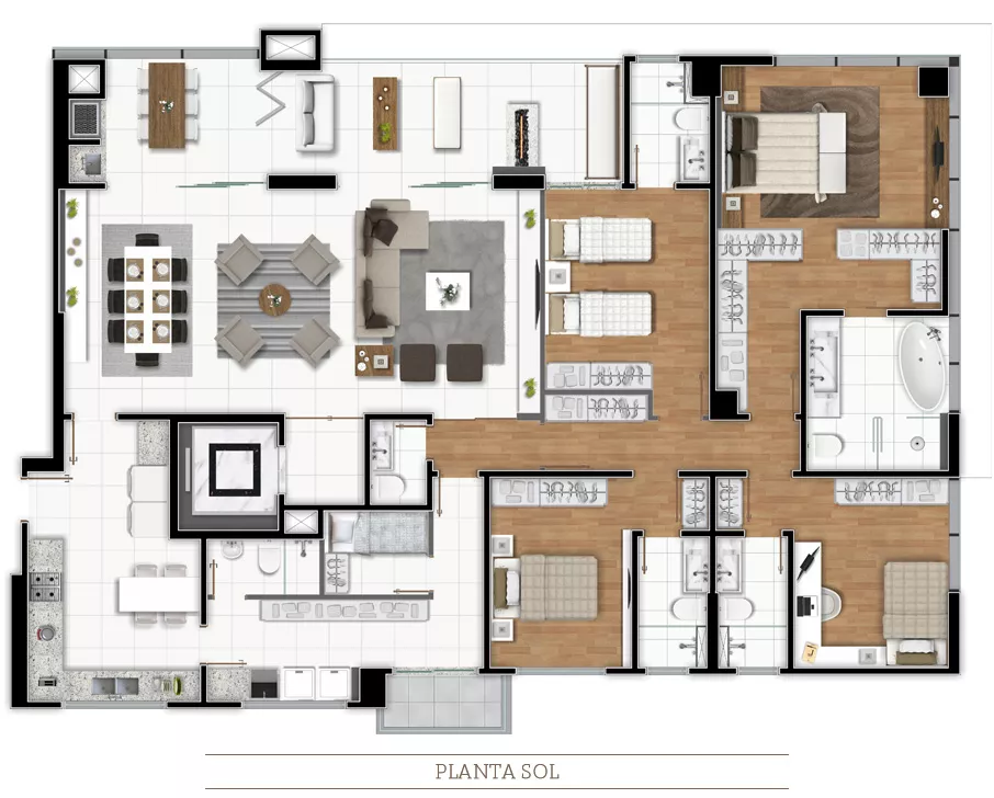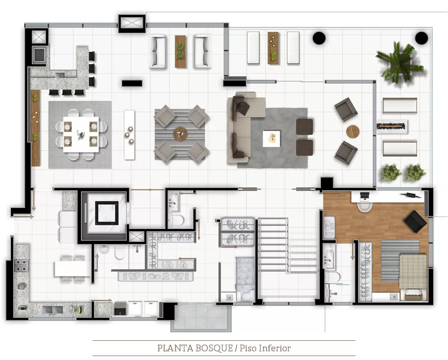 Tratamento termoacústico em pisos e paredes das unidades, vidros duplos de alta performance e calefação por meio de piso aquecido são alguns dos relevantes diferenciais Padrão Laguna.