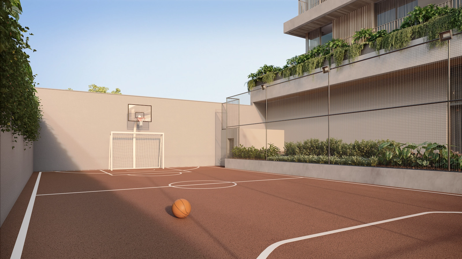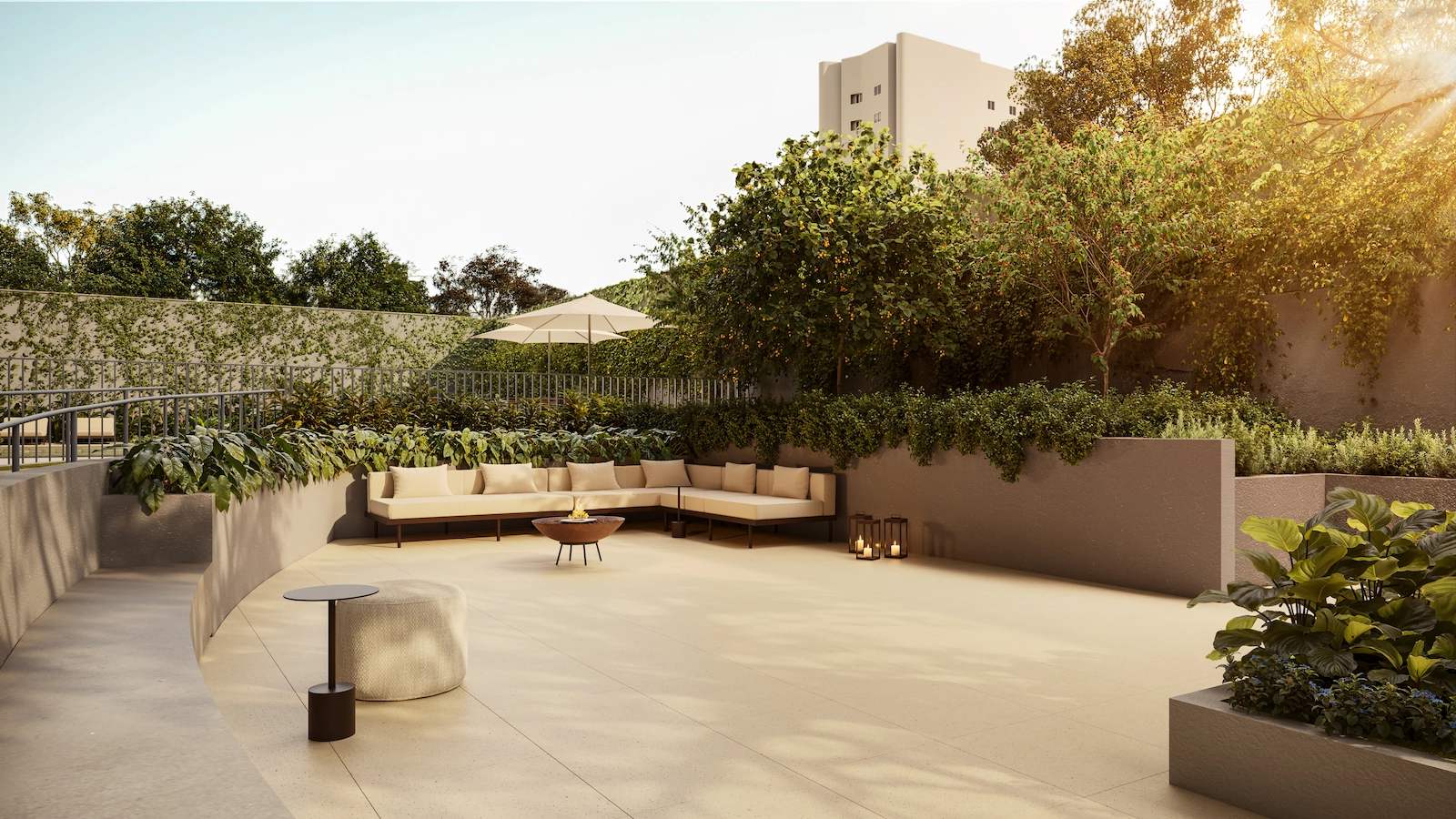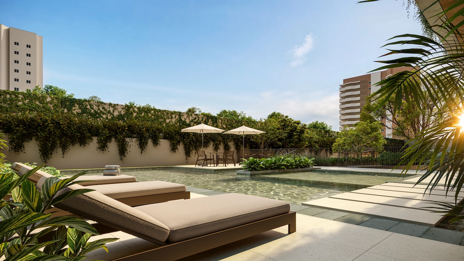 - Espaços restauradores (praça, piscina, academia e horta);