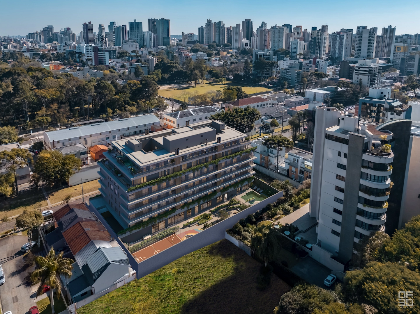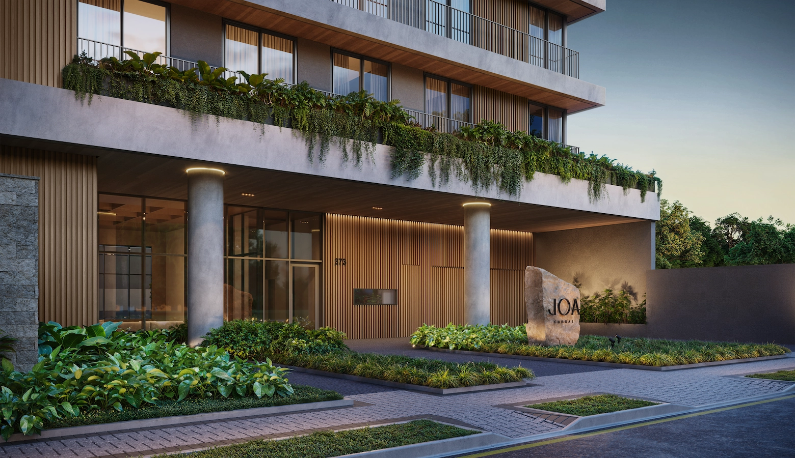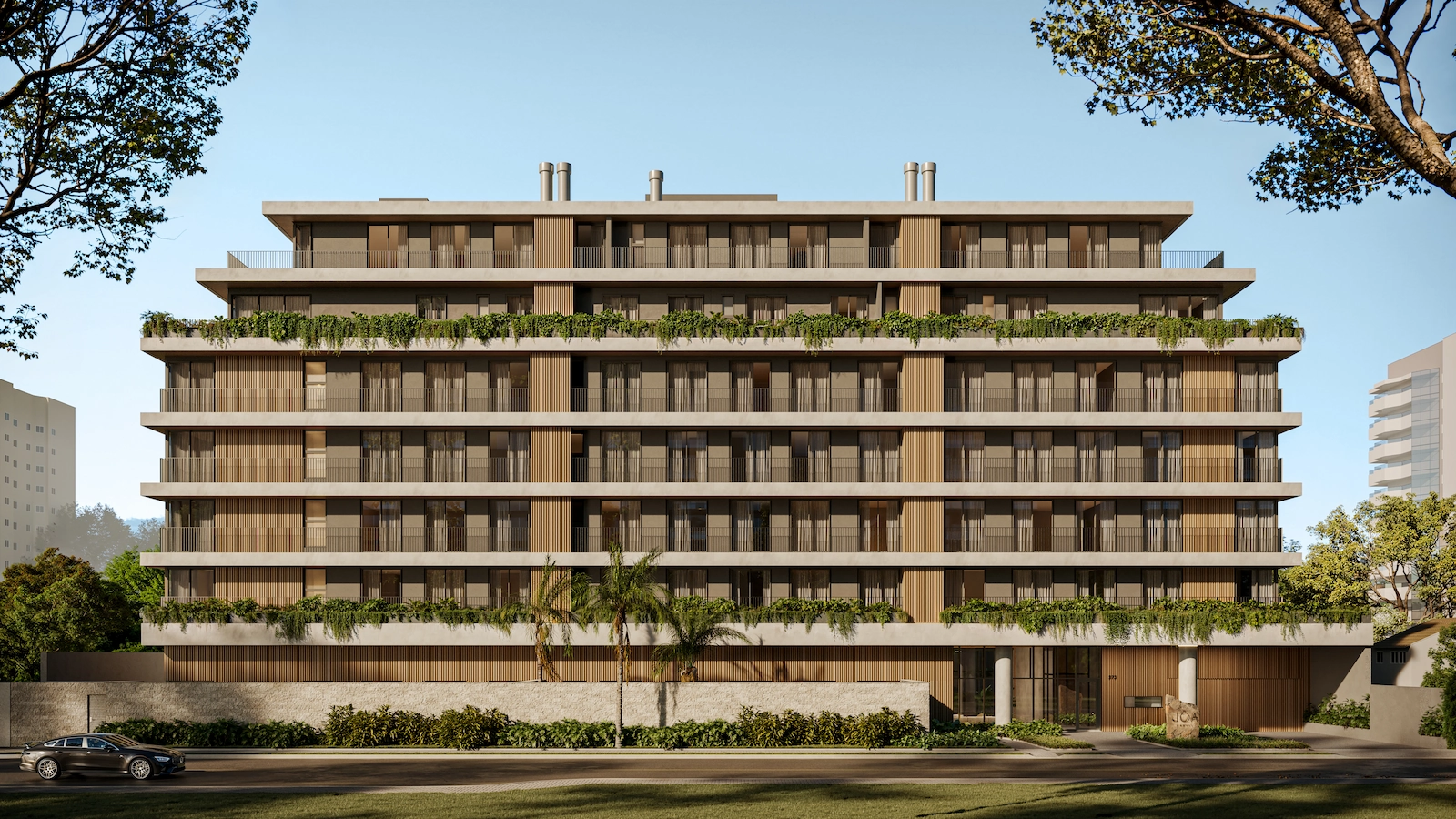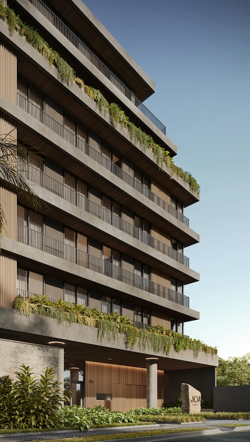 “O conceito do JOÁ nasceu de um traço curvo desenhado no amplo espaço posterior da torre, estrutura que se tornou a espinha dorsal do projeto. Este traço foi se transformando em formas e espaços que se encaixam de maneira orgânica: a piscina externa se conecta à interna, o salão de festas, ao terraço, a área de estar, ao espaço pet. Tudo se conecta com uma grande praça emoldurada por vegetação.”