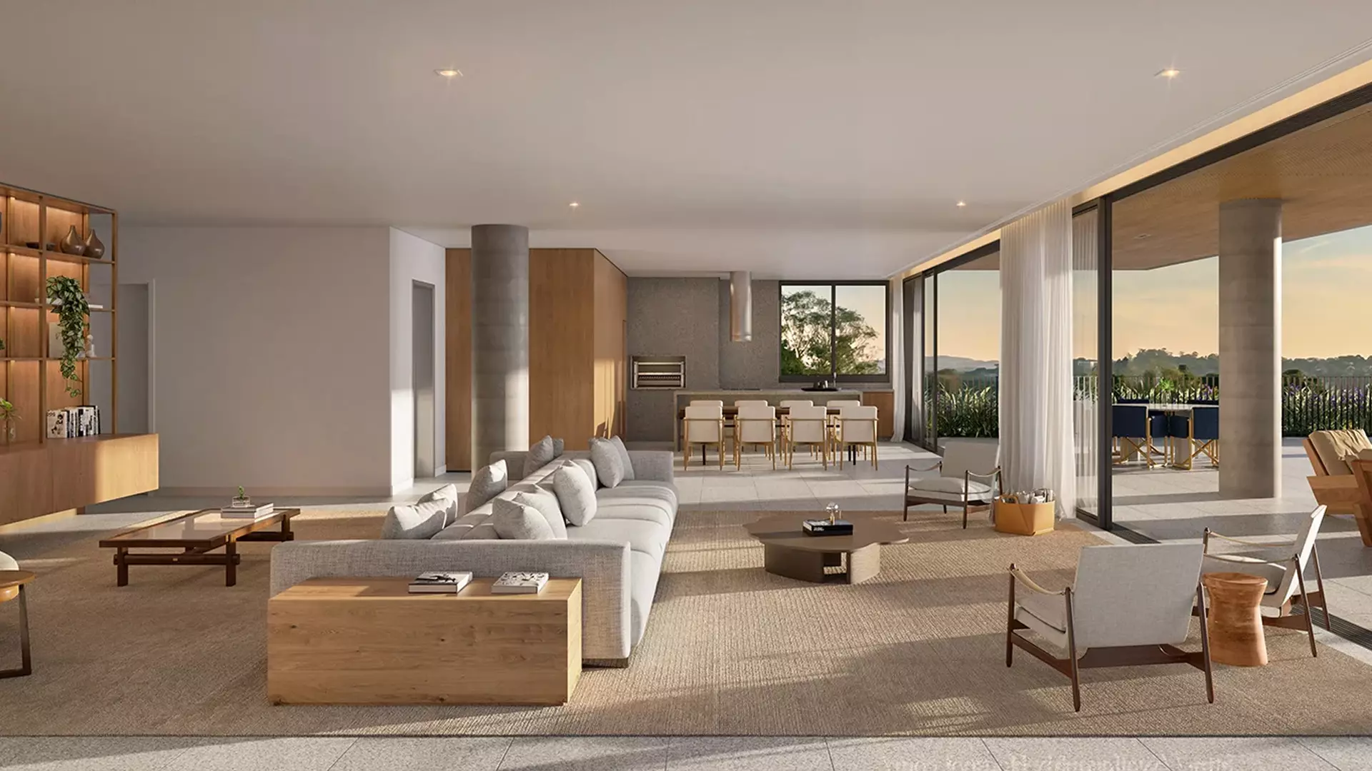Esquadrias minimalistas com amplas aberturas nas áreas sociais;