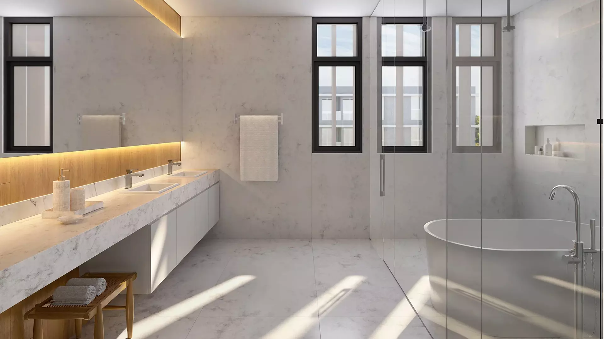 Piso, parede do box e bancada dos banheiros em mármore branco;