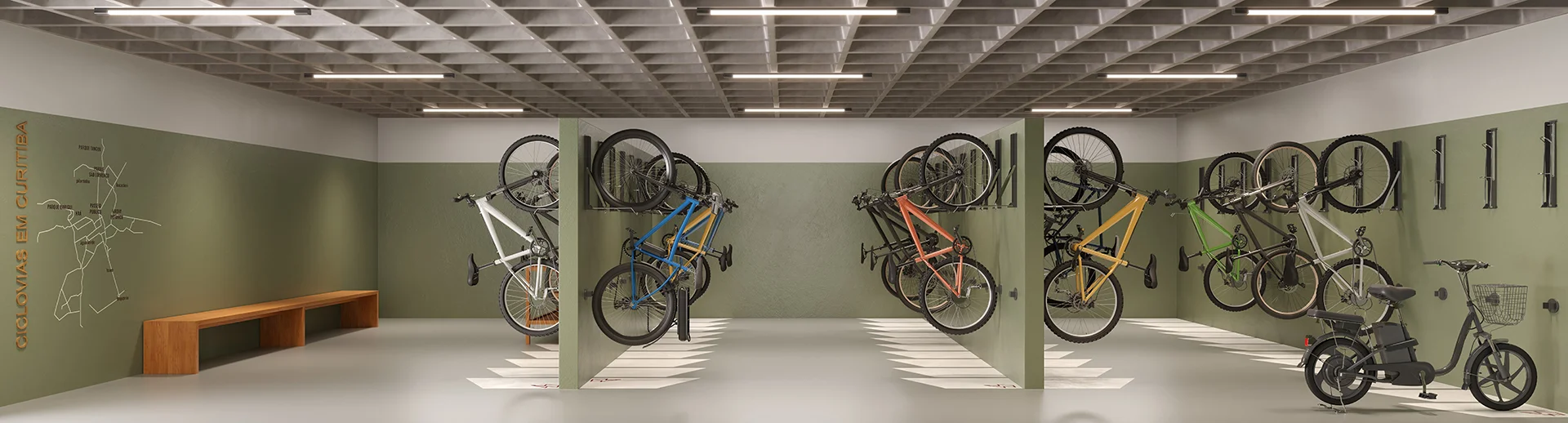 Bicicletário com oficina e ponto de carregamento para bike elétrica.