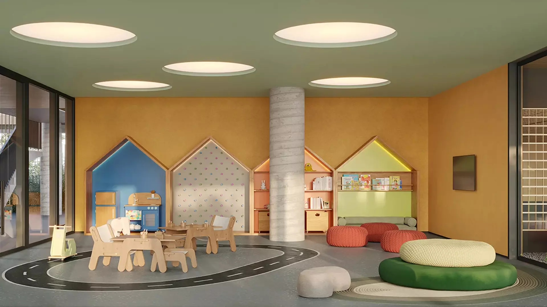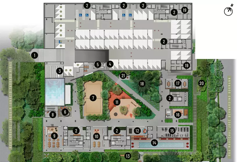 Espaços restauradores: praça, terraços externos, piscina, academia e horta.