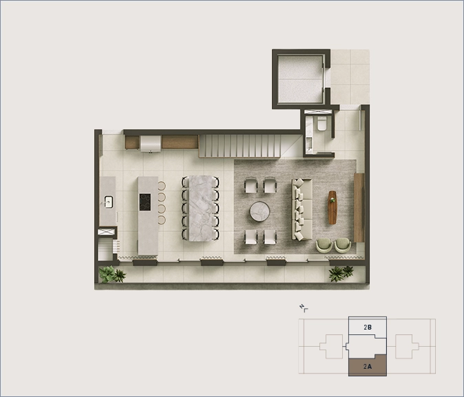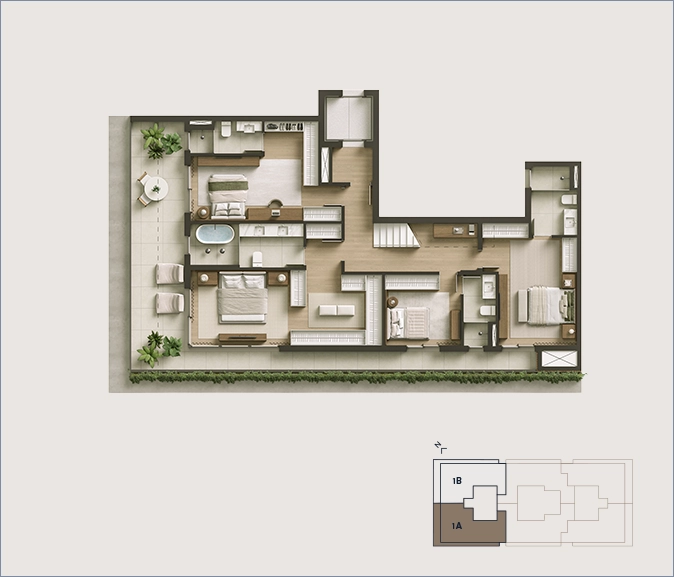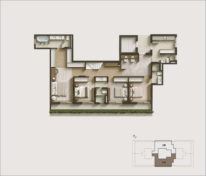 *As áreas indicadas incluem terraços e sacadas. Pé-direito livre de 2,65m nas áreas sociais e suítes das residências tipo e residências duplex | 3m nas áreas sociais das residências jardim | 2,80m nas suítes das residências jardim | 2,50m nos banheiros e áreas de serviço.