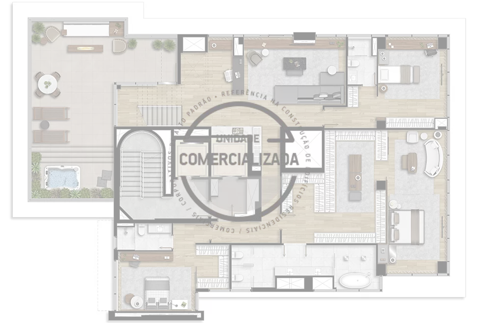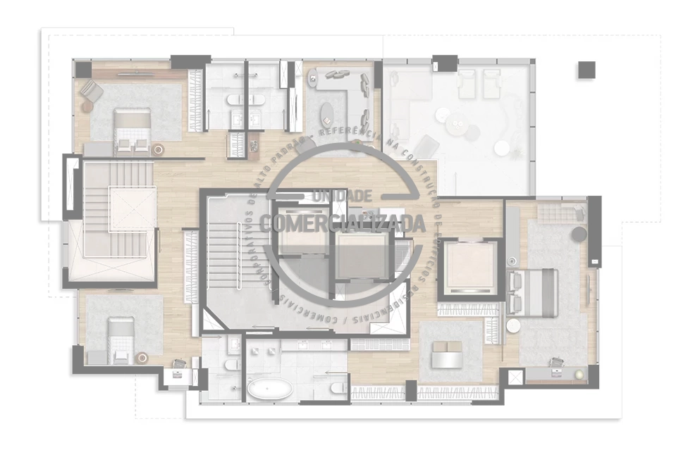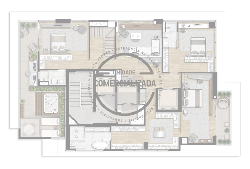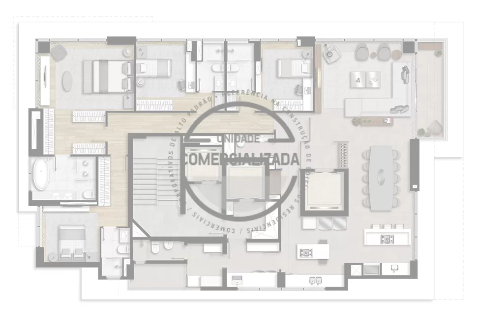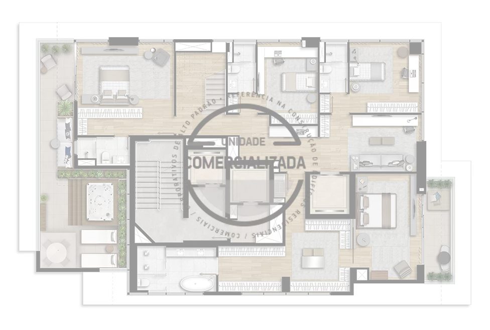 - Piso aquecido na área íntima (suítes e banheiros – exceto área do box) com termostato digital e controle individual da temperatura por ambiente