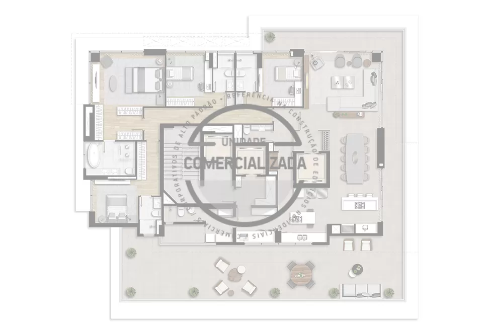 Tratamento termoacústico em pisos e paredes das unidades, vidros duplos de alta performance e calefação por meio de piso aquecido são alguns dos relevantes diferenciais Padrão Laguna.